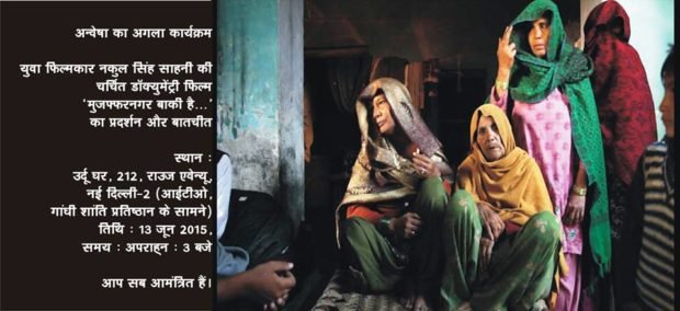 Screening of the much talked about documentary film Muzaffarnagar Baaqi Hai- Muzaffarnagar Eventually by young filmmaker Nakul Singh Sawhney followed by a discussion. Venue: Urdu Ghar, 212, Rouse Avenue, New Delhi -2 ( Opposite: ITO, Gandhi Peace Foundation) Date: 13 June 2015; Time 3 pm |